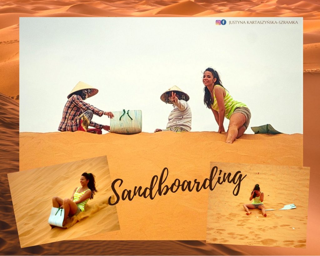 Sandboarding jest jazdą na czymś w rodzaju deski snowboardowej po piasku. W Wietnamie na wydmach, kobiety oferującą kawałek czegoś w rodzaju gumy, na której można zjeżdżać raczej tylko w pozycji siedzącej. Fajna zabawa, warto spróbować ale ostrzegam, piasek dostaje się wszędzie!